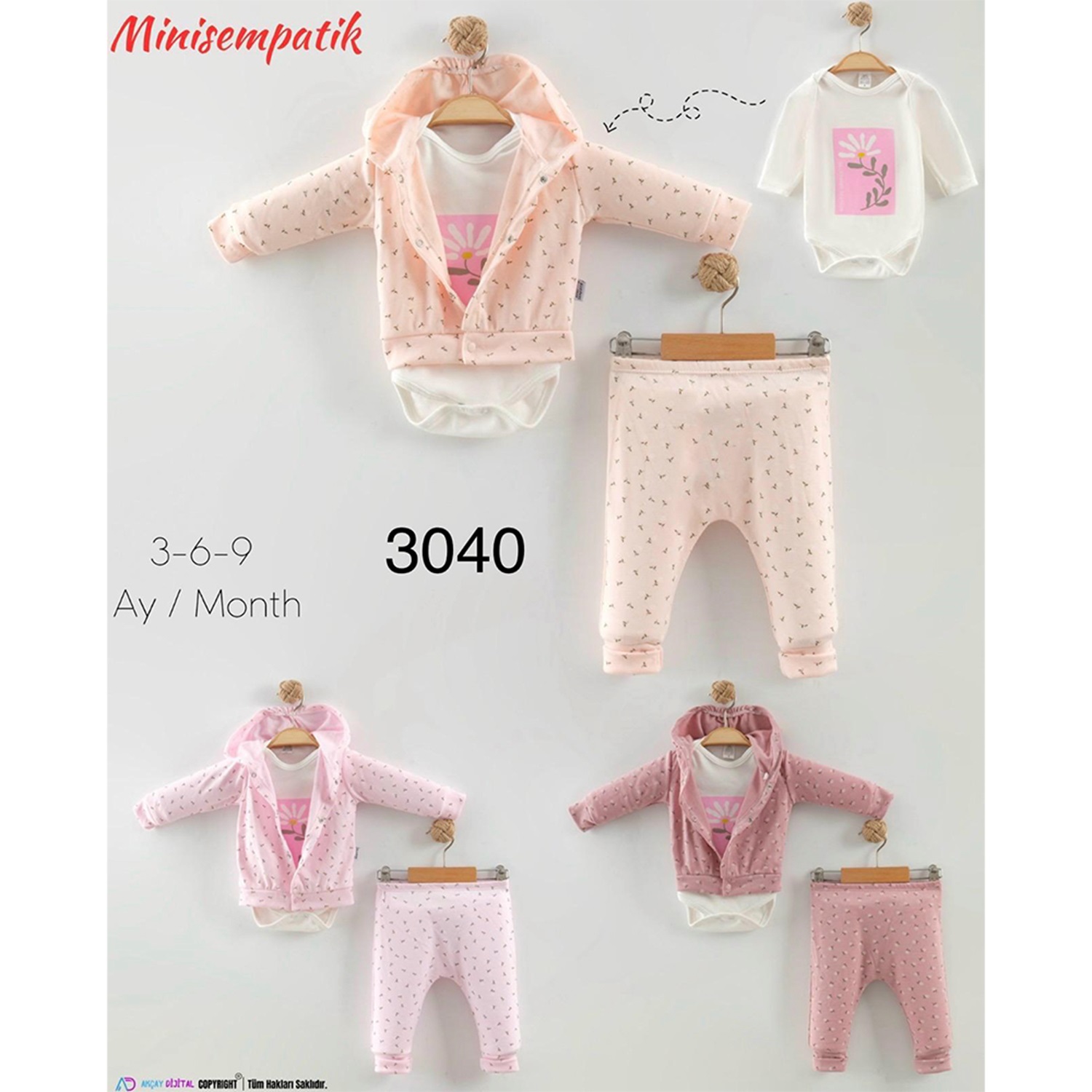 Mini Sempatik 3040 Kız Bebe Penye Çiçek Baskılı Badili 3 Lü Takım 3-9 Ay