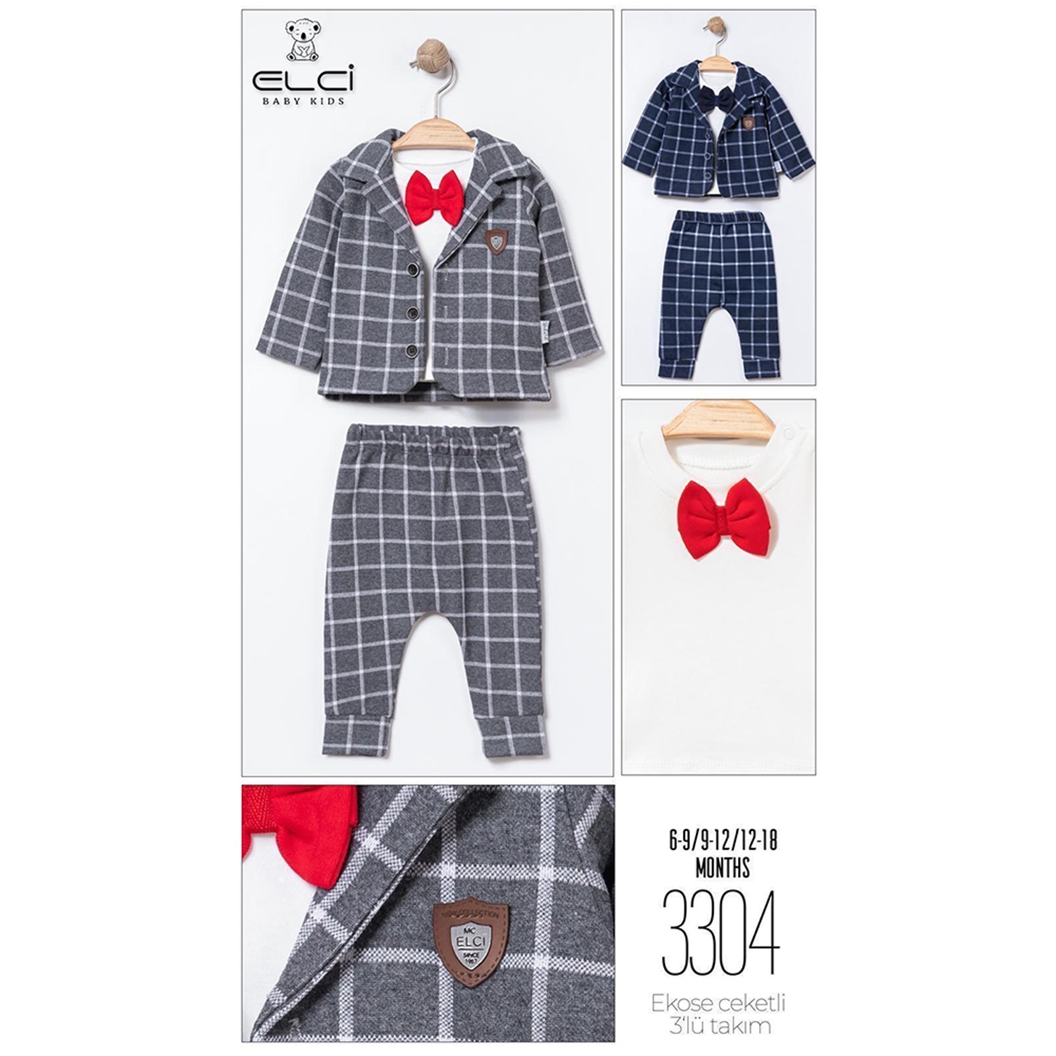 Elci 3304 Erkek Bebe Papyonlu Ekose Ceketli 3 Lü Takım 6-18 Ay