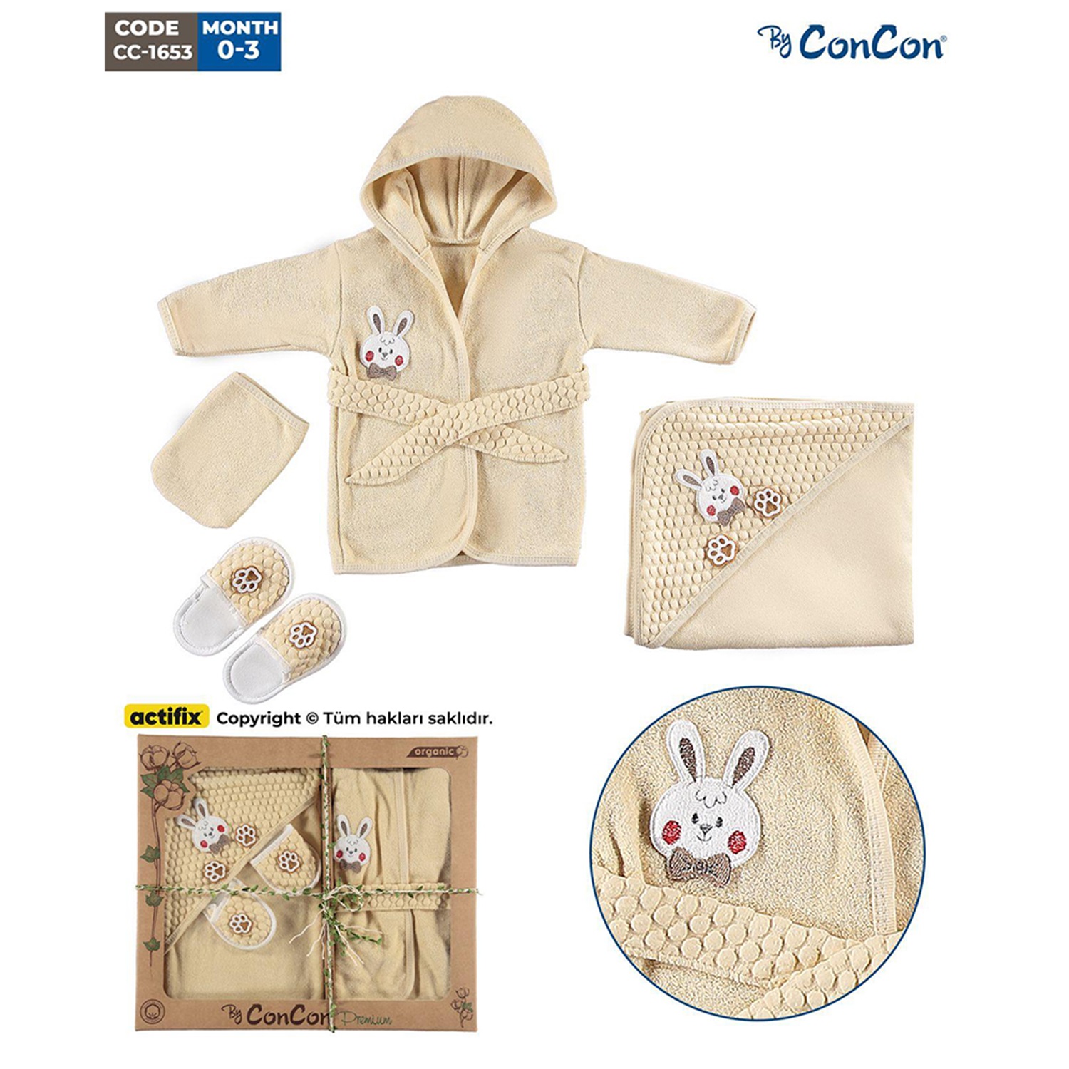 ConCon 1653 Bebe Organik Sevimli Tavşan Nakışlı 3 Parça Bornoz Seti 0-1 Yaş