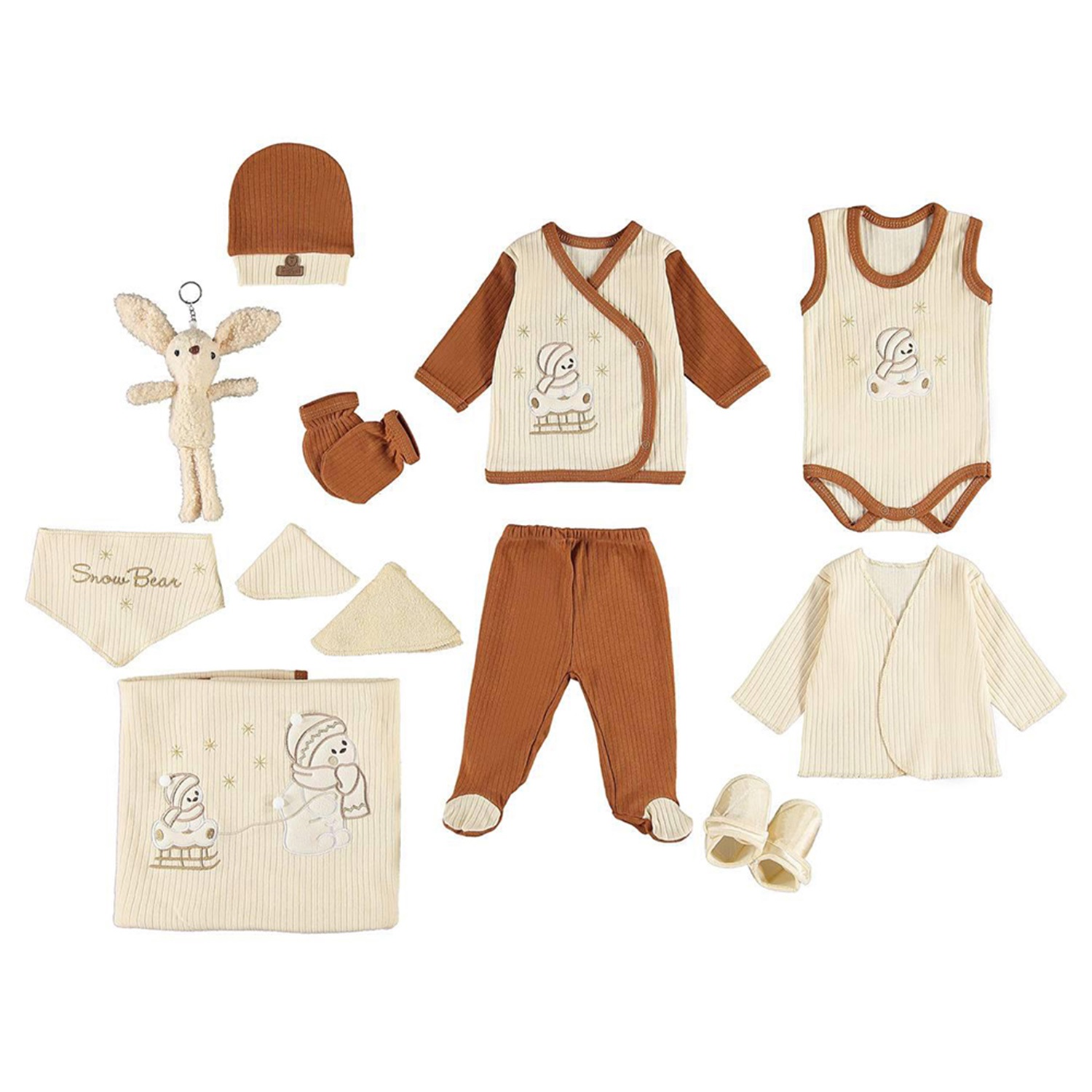 İçindekiler : 1 Adet Üst Zıbın, 1 Adet Patikli Pantolon, 1 Adet Alttan Çıtlı Badi, 1 Adet İç Zıbın, 1 Adet Mama Önlüğü, 1 Adet Şapka, 1 Çift Eldiven, 1 Çift Çorap, 1 Adet Battaniye, 1 Adet Mendil, 1 Adet Ter Bezi