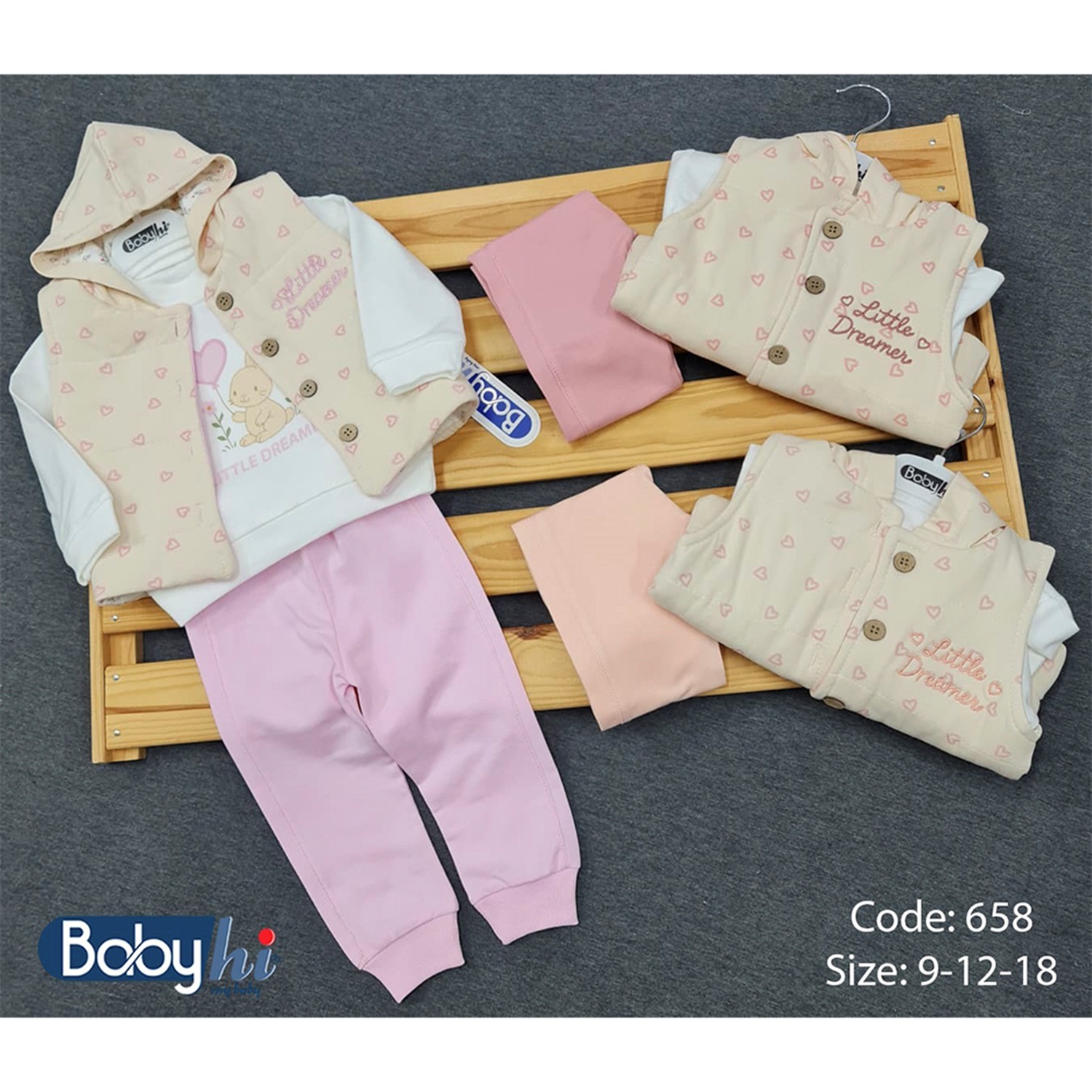 Baby Hi 658 Kız Bebe 2 İp Kalp Baskılı Yelekli 3 Lü Takım 9-18 Ay