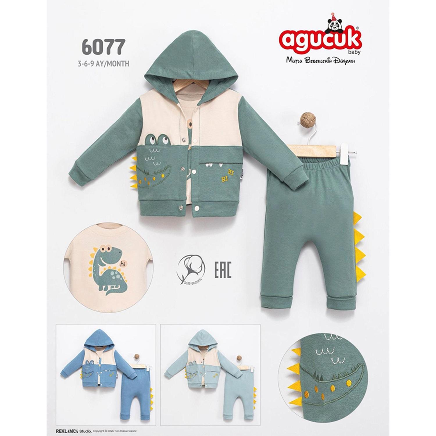Agucuk Baby 6077 Erkek Bebe Sevimli Dinozor Baskılı Kapşonlu 3 Lü Takım 3-9 Ay