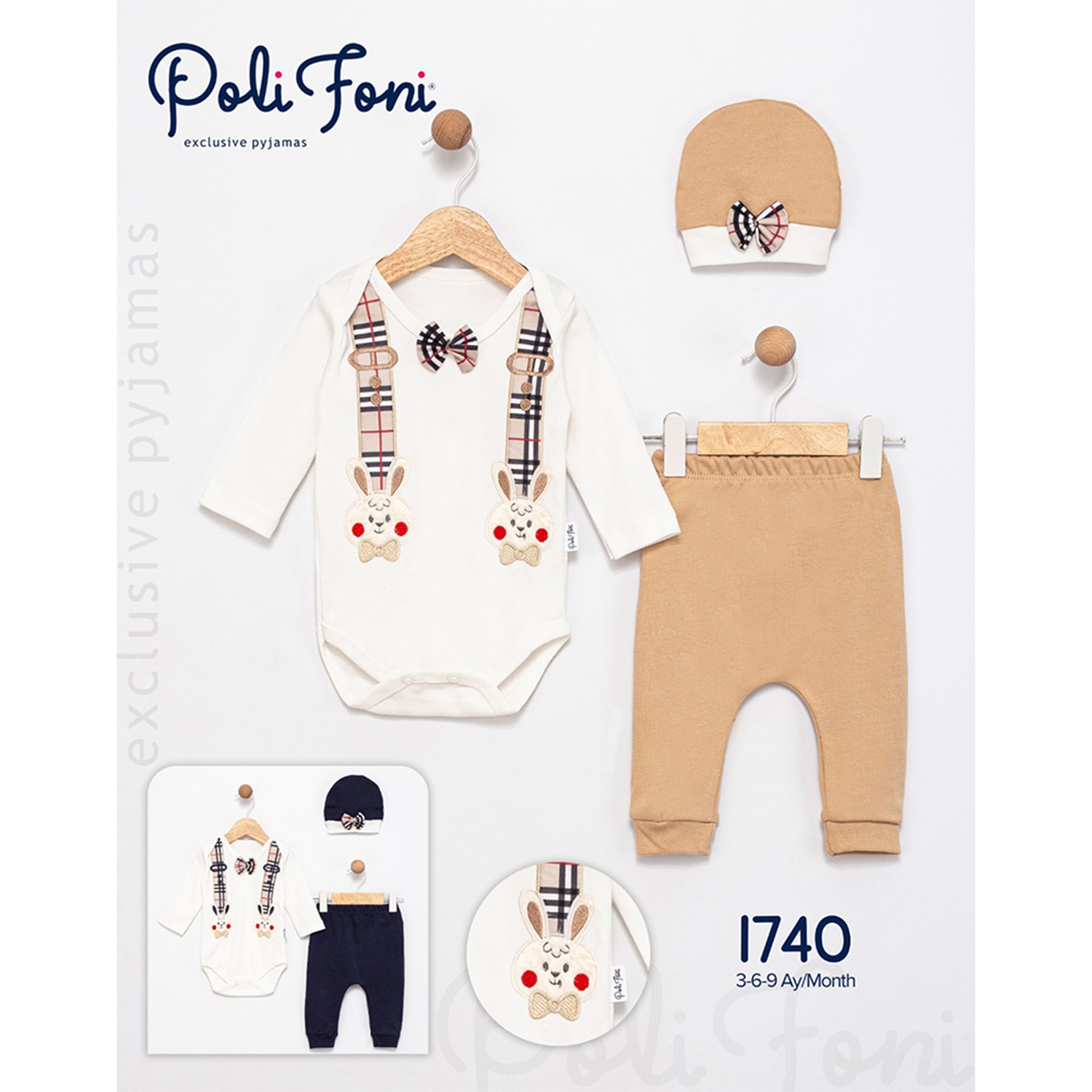 Polifoni 1740 Erkek Bebe Penye Sevimli Tavşan Nakışlı 3 Parça Badili Takım 3-6 Ay