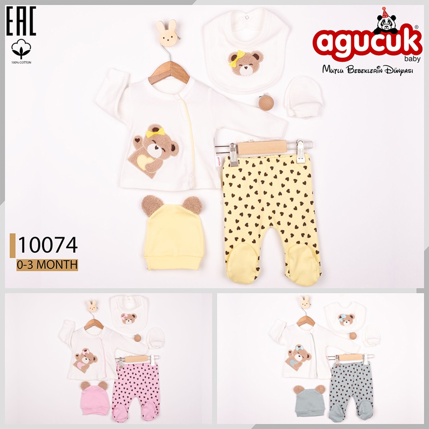 Agucuk Baby 10074 Kız Bebe Penye Süzine Ayıcık Nakışlı Patikli Şapkalı 5 Li Zıbın Takım 0-3 Ay