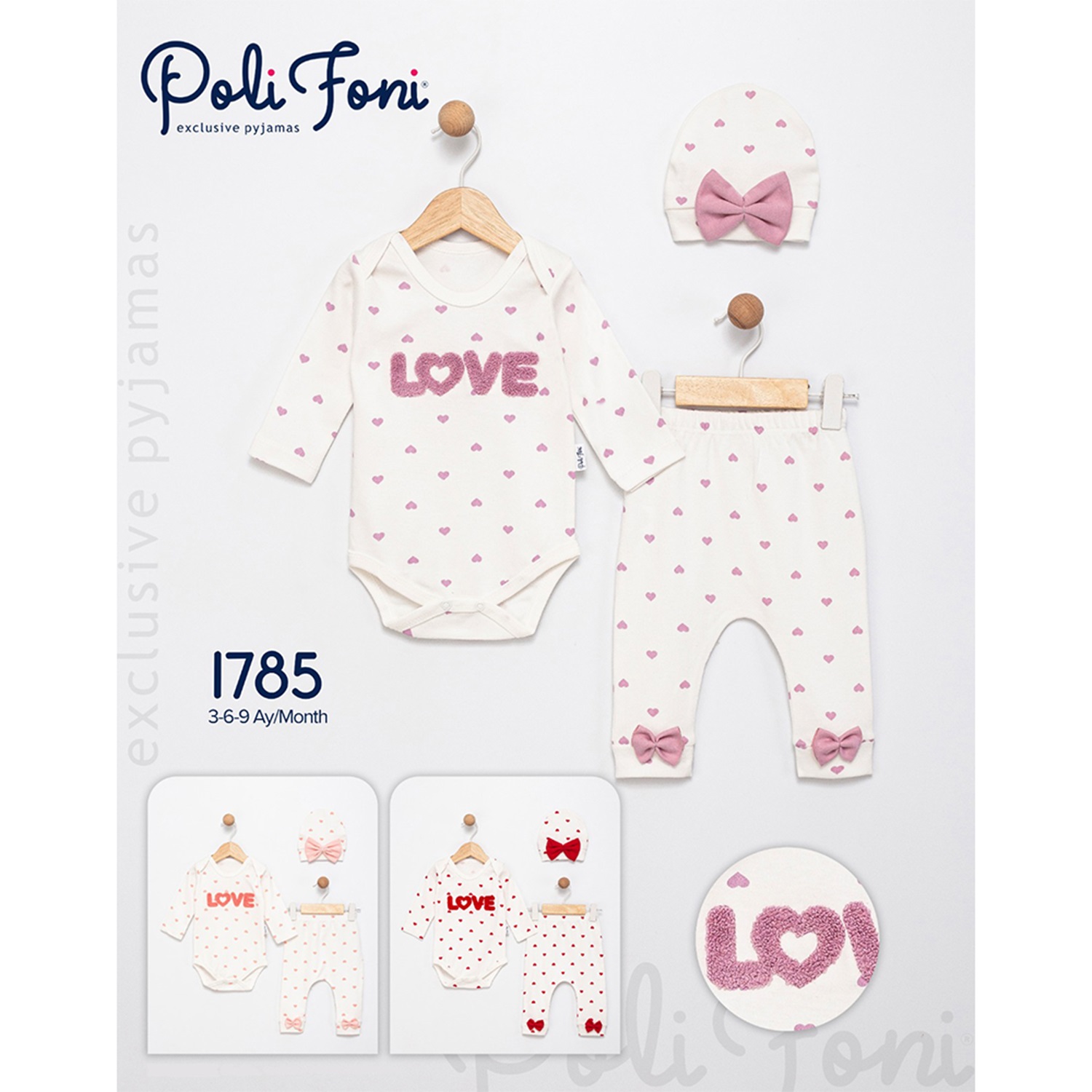 Polifoni 1785 Kız Bebe Empirme Süzine Kalp Nakışlı 3 Parça Badili Takım 3-6 Ay