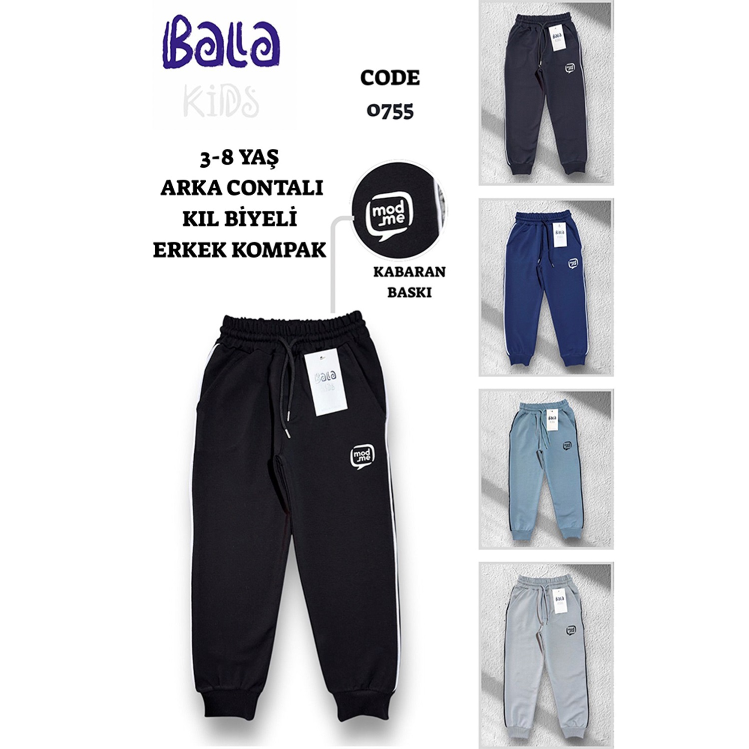 Bala 0755 Erkrk Çocuk Kompak Penye Yan Kıl Biyeli Modme Baskılı Eşofman Alt 3-8 Yaş