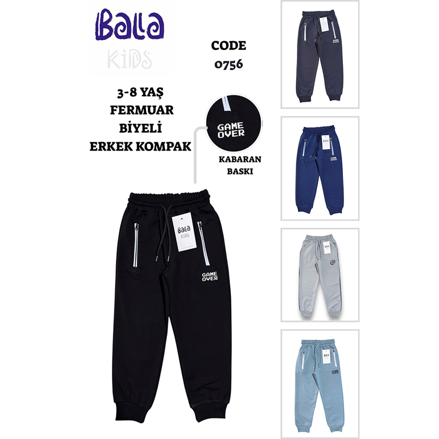 Bala 0756 Erkrk Çocuk Kompak Penye Fermuarlı Biyeli Game Over Baskılı Eşofman Alt 3-8 Yaş