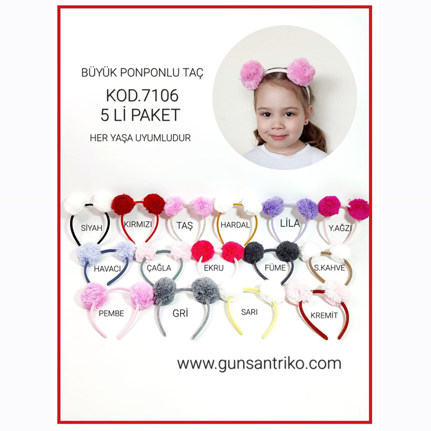 Gogo Bici 7106 Kız Çocuk Büyük Ponponlu Taç 5 Li - Kırmızı