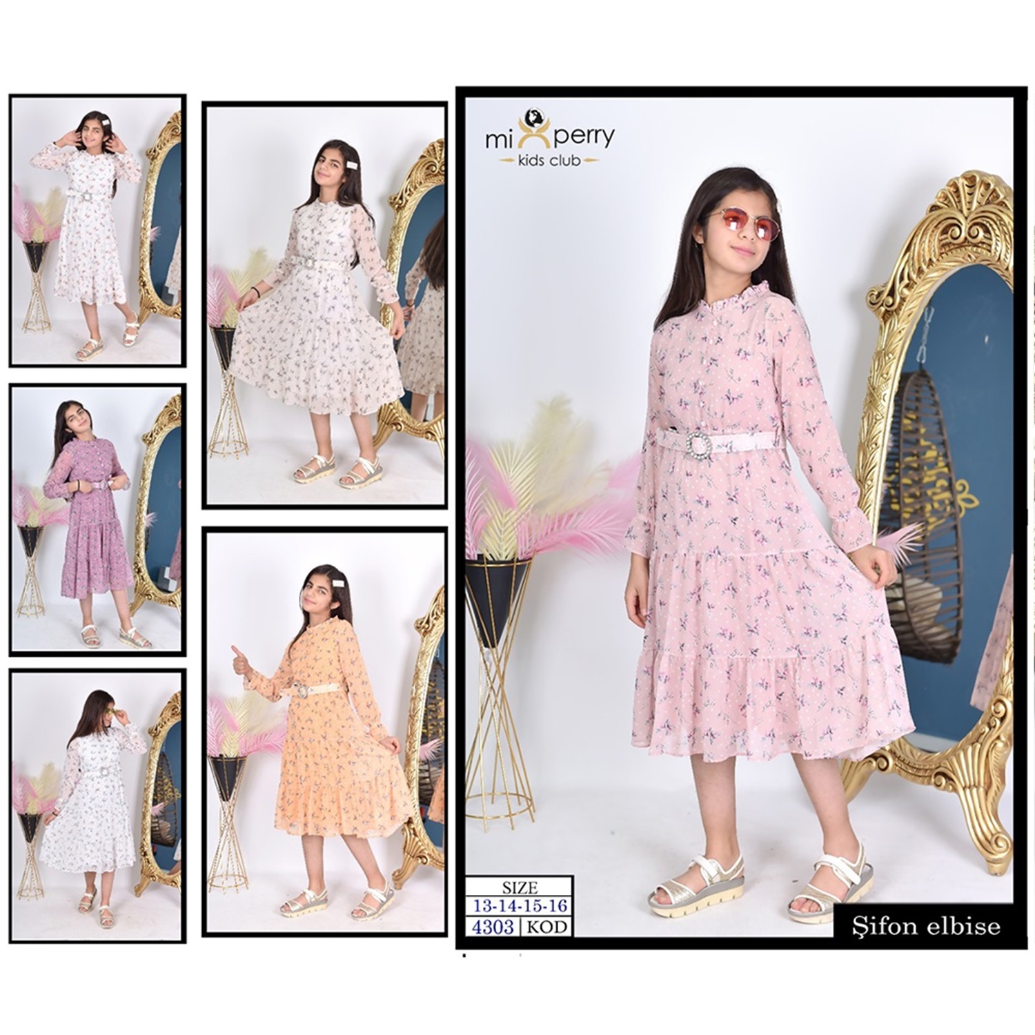 Mix Life 4303 Kız Çocuk Yakası Fırfırlı Düğmeli Şifon Gez Elbise 13-16 Yaş