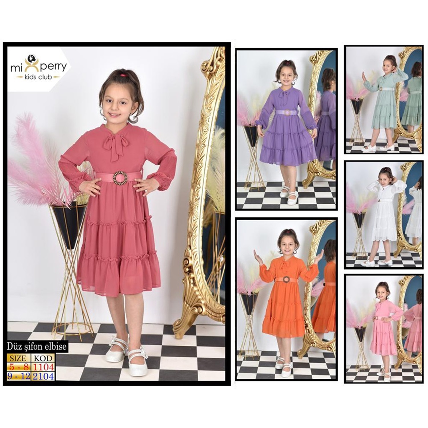 Mixperry 2104 Kız Çocuk Yakası Kemerli Şifon Elbise 9-12 Yaş