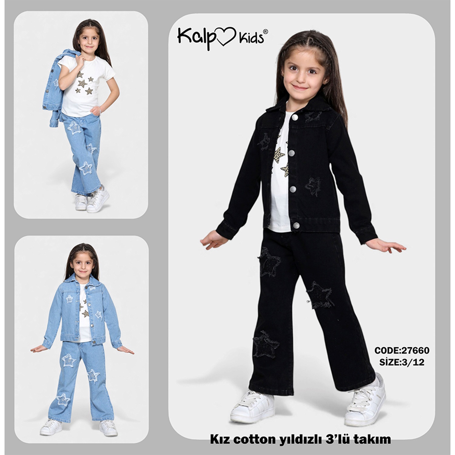 Kalp Kids 27664-2 Kız Çocuk Yıldız Nakışlı 3 Lü Kot Takım 8-12 Yaş
