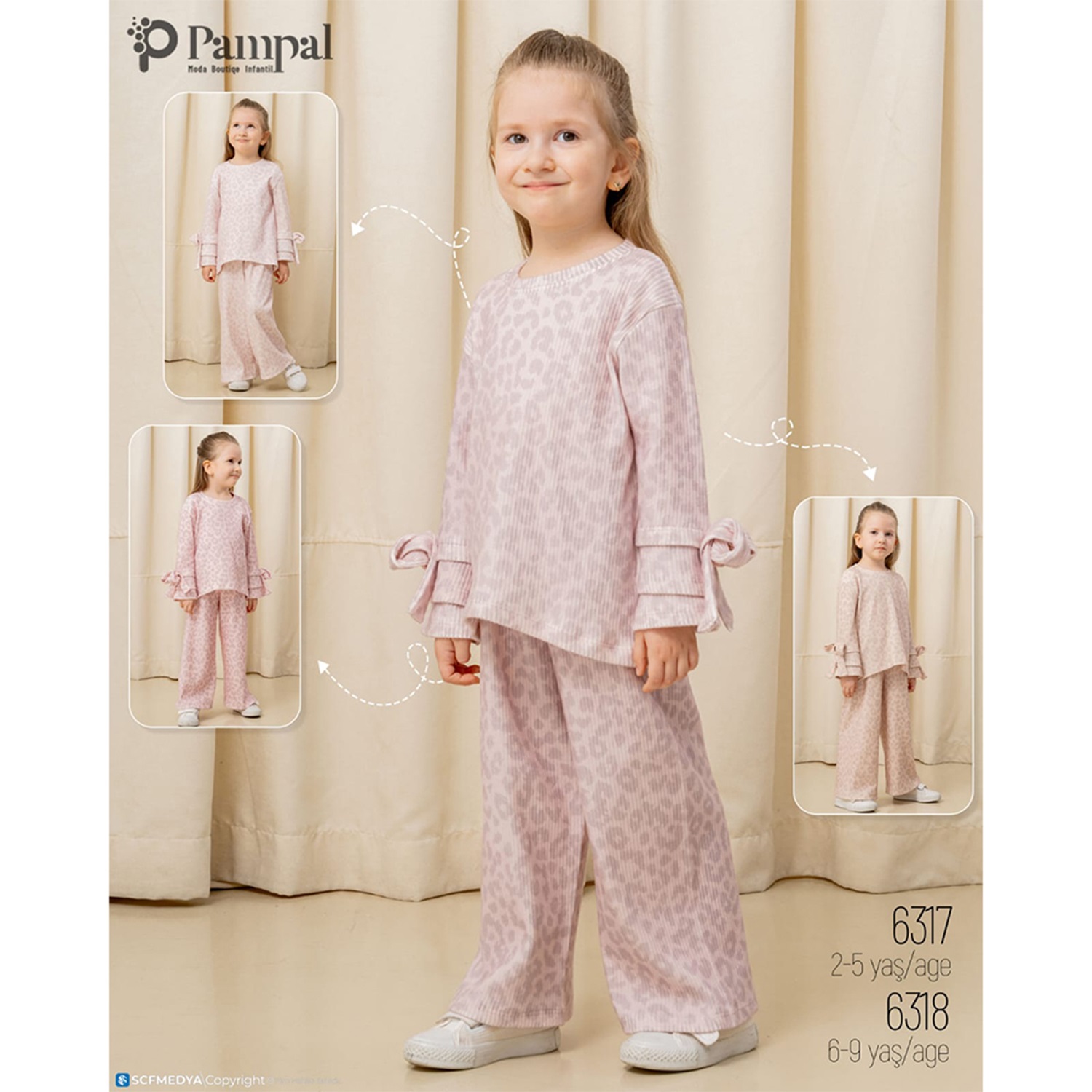 Pampal 6318 Kız Çocuk 3 İplik Dijital Baskılı Kol Kabartma Çiçek Nakışlı Fitilli Takım 6-9 Yaş