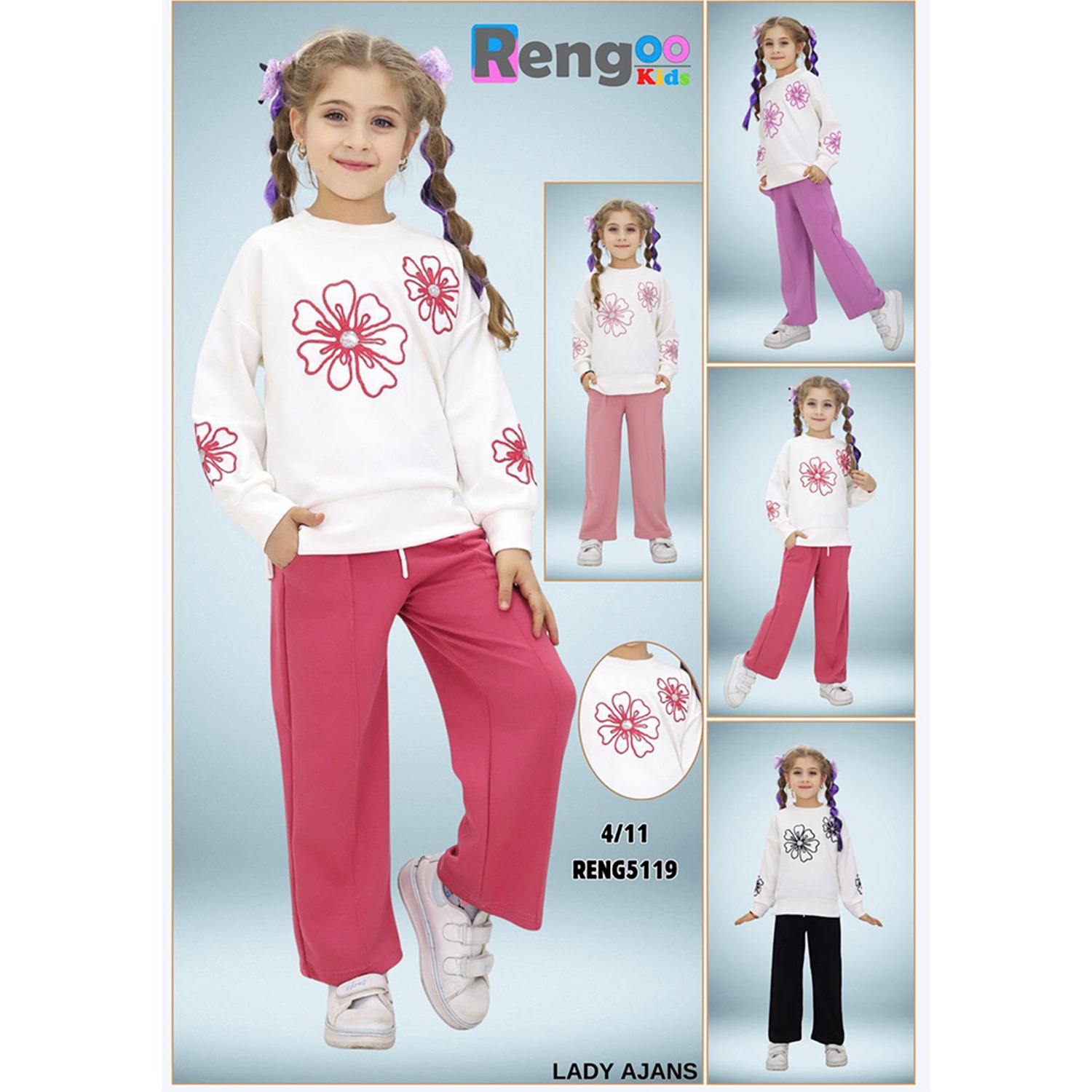 Rengoo 5119 Kız Çocuk 2 iplik Oysho kollu Ve Önü Zincir Çiçek Nakışlı Sıfır Yaka Takım 4-11 Yaş