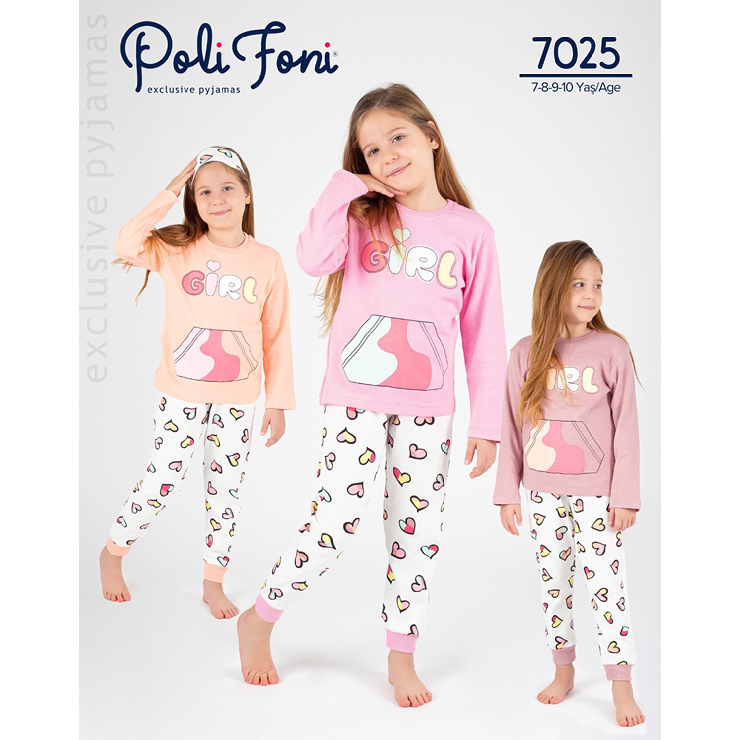 Polifoni 7025 Kız Çocuk Penye Kalpli Gırl Baskılı Pijama Takımı 7-10 Yaş