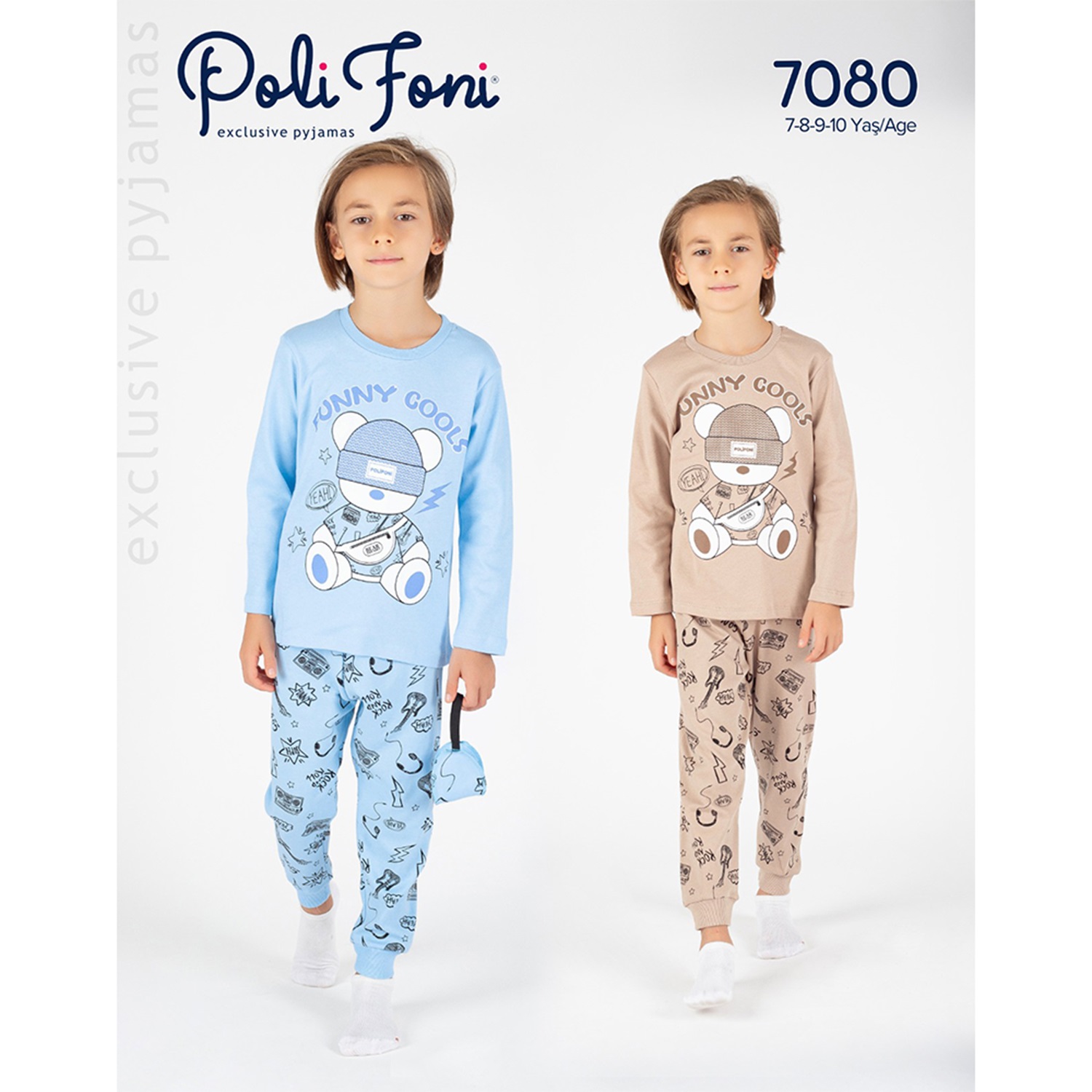 Polifoni 7080 Erkek Çocuk Penye Şapkalı Ayıcık Baskılı Pijama Takımı 7-10 Yaş