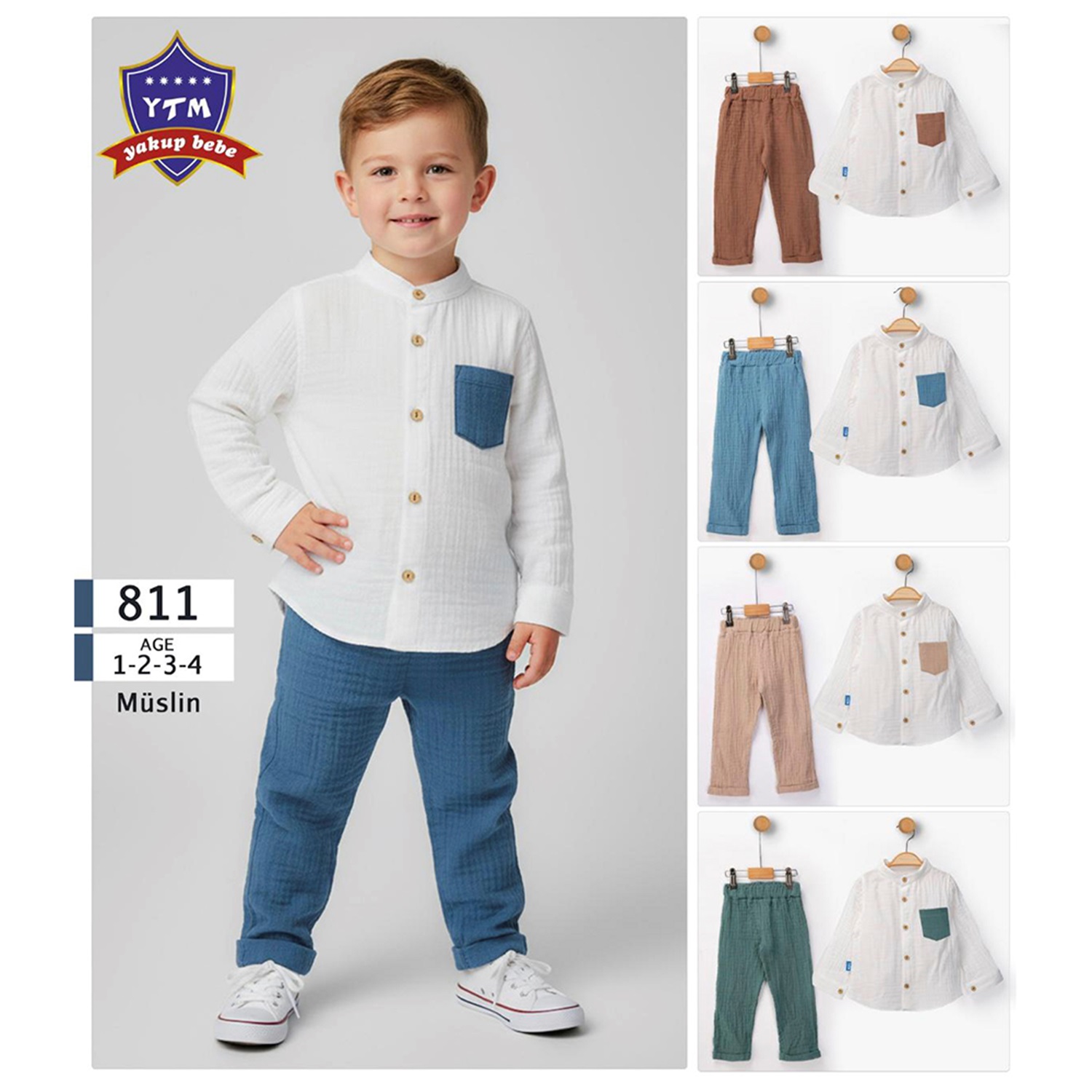 YTM 811 Erkek Çocuk Müslin Kumaş Ön Cepli Düğmeli Takım 1-4 Yaş - 40909-Karışık Renk -1-4 YAŞ