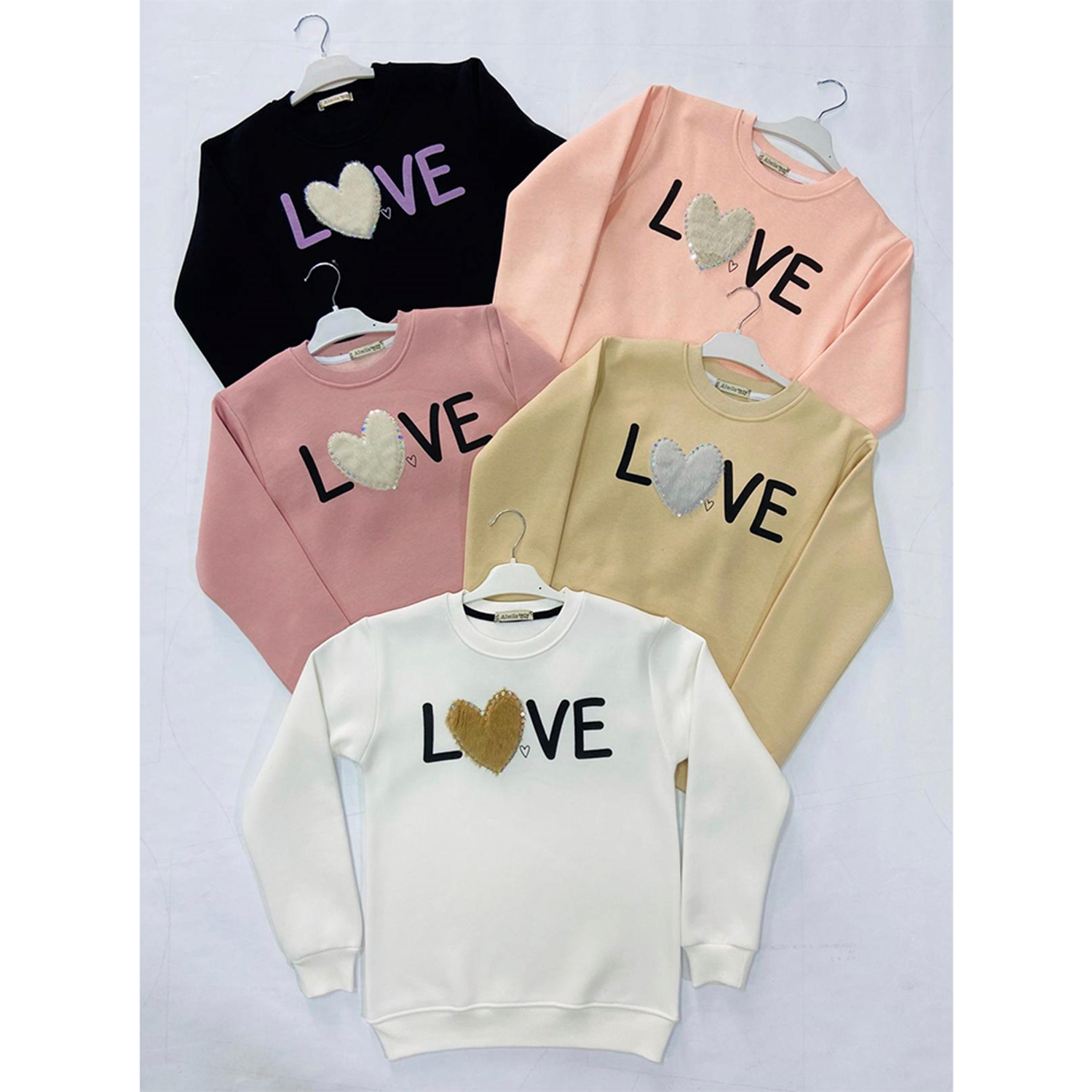 Almila 8071 Kız Çocuk 3 İplik Love Peluş Kalp Nakışlı Sıfır Yaka Sweat 5-8 Yaş