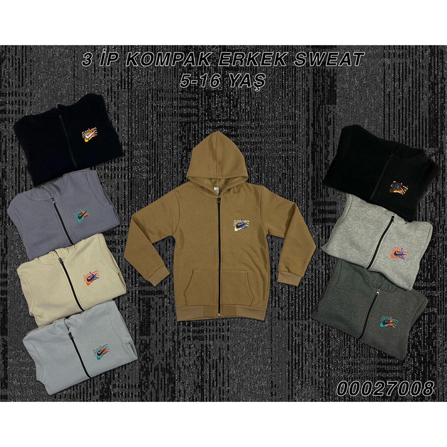 Uçar 7008-2 Erkek Çocuk 3 İp Kompak Penye Kanguru Cepli Fermuarlı Kapşonlu Sweat Ceket 9-12 Yaş