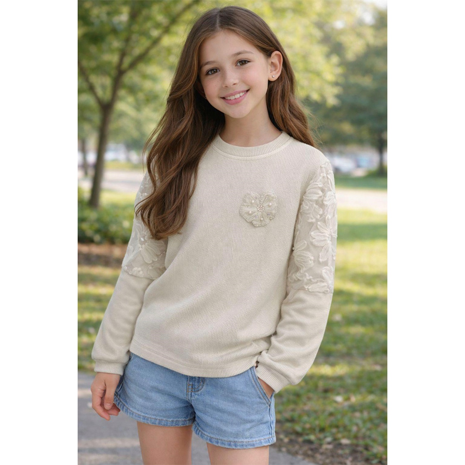 Almila 9177 Kız Çocuk Fitili Kol Güllü Nakışlı Sıfır Yaka Sweat 9-12 Yaş