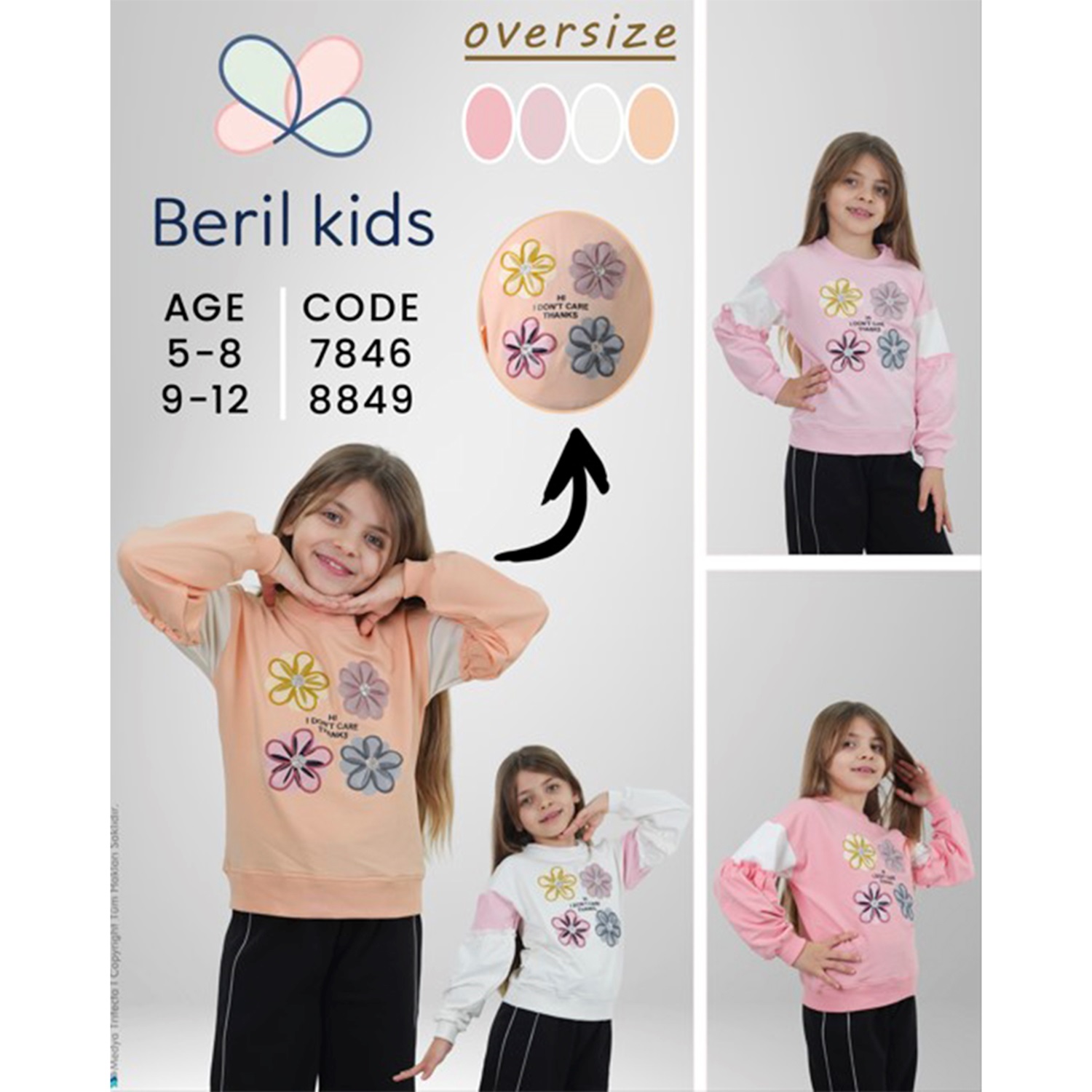 Beril 7846 Kız Çocuk 2 İp Taş Çiçek Nakışlı Sweat 5-8 Yaş