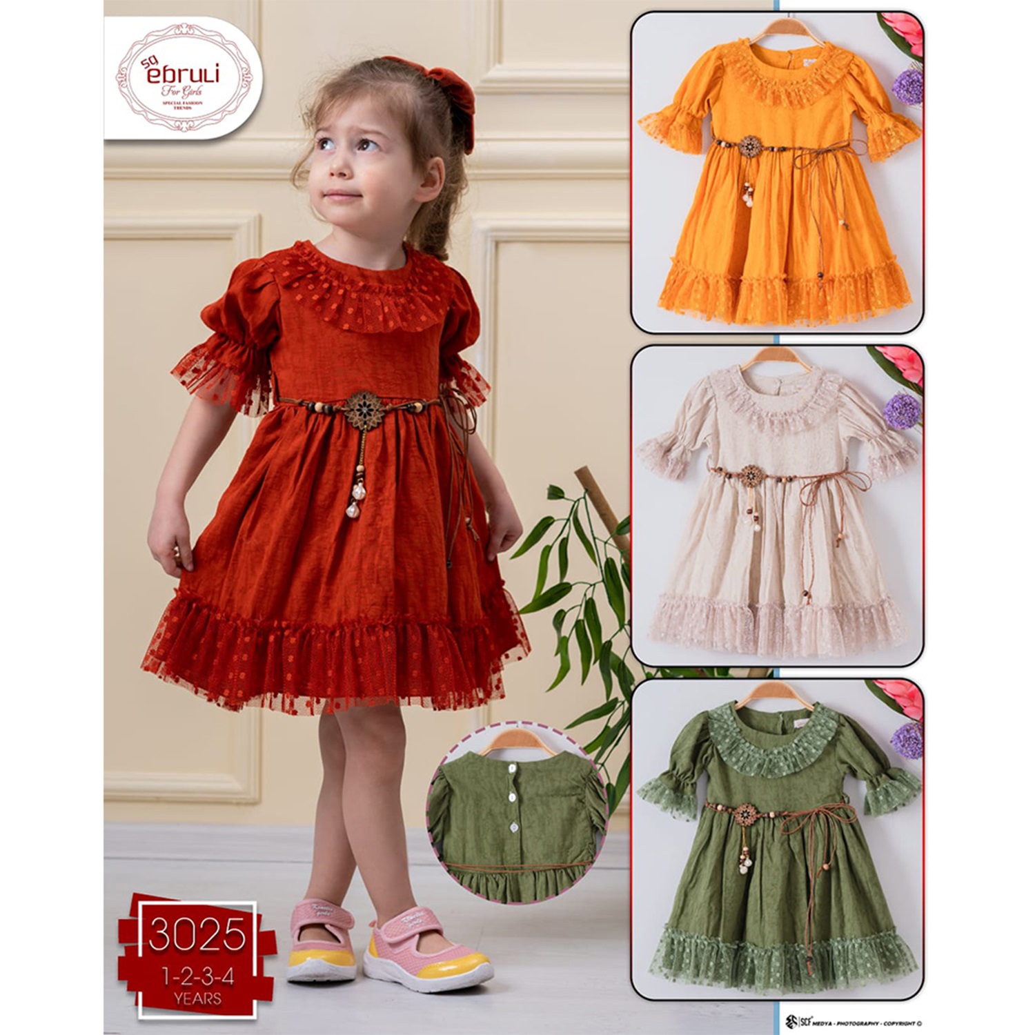 Ebruli 3025 Kız Çoçuk Yuvarlak Yaka Puantiyeli Fırfırlı Elbise 1-2-3-4 Yaş