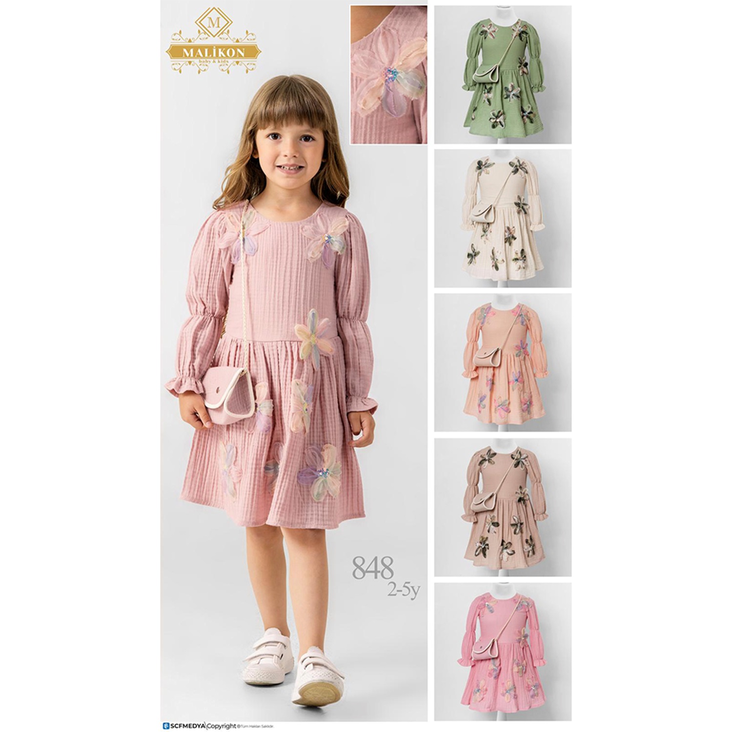 Mali-Kon 848 Kız Çocuk Müslum Laseli Çiçekli Çantalı Elbise 2-5 Yaş