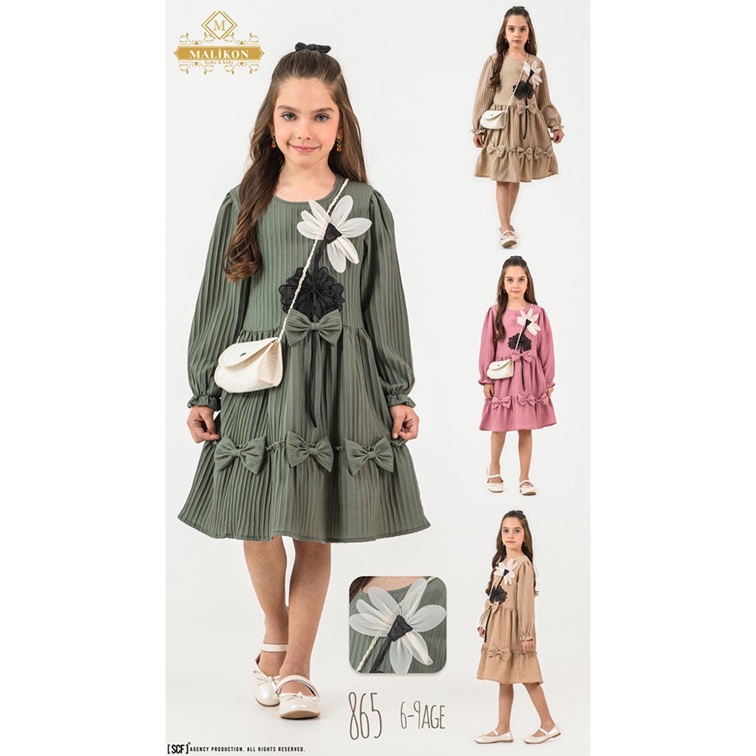 Mali-Kon 865 Kız Çocuk Çiçek Motifli Çantalı Elbise 6-9 Yaş