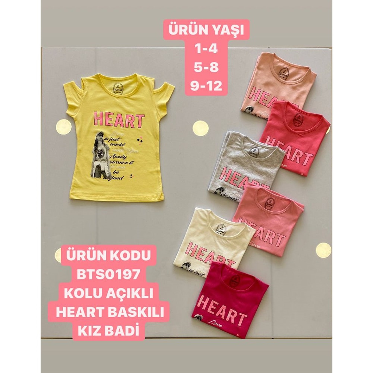 Bittoş 0197 Kız Çocuk Kolu Açıklı Heart Baskılı Penye Tişört 9-12 Yaş
