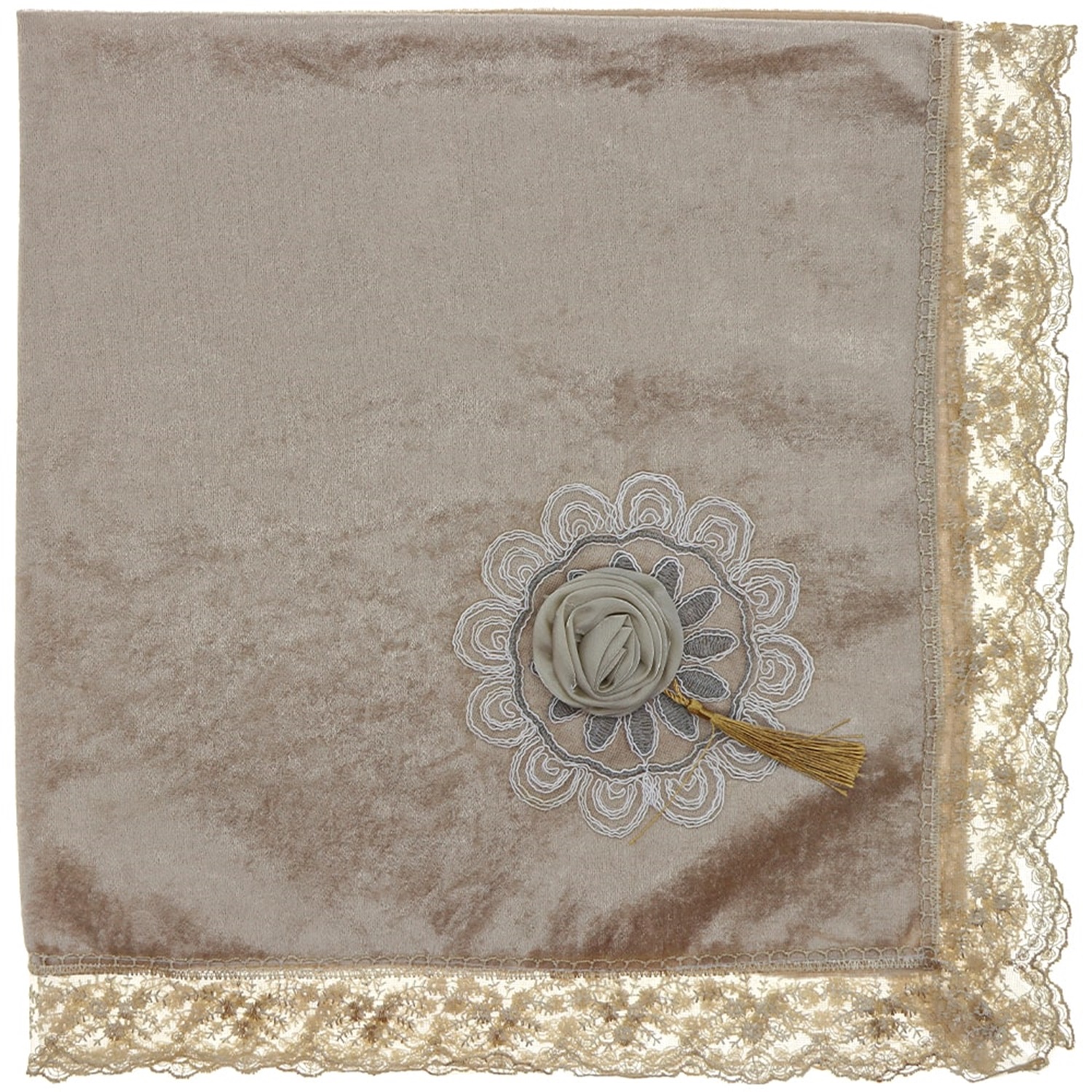 ÖFG Kadife Güllü Püsküllü Bohça - Bej - STANDART