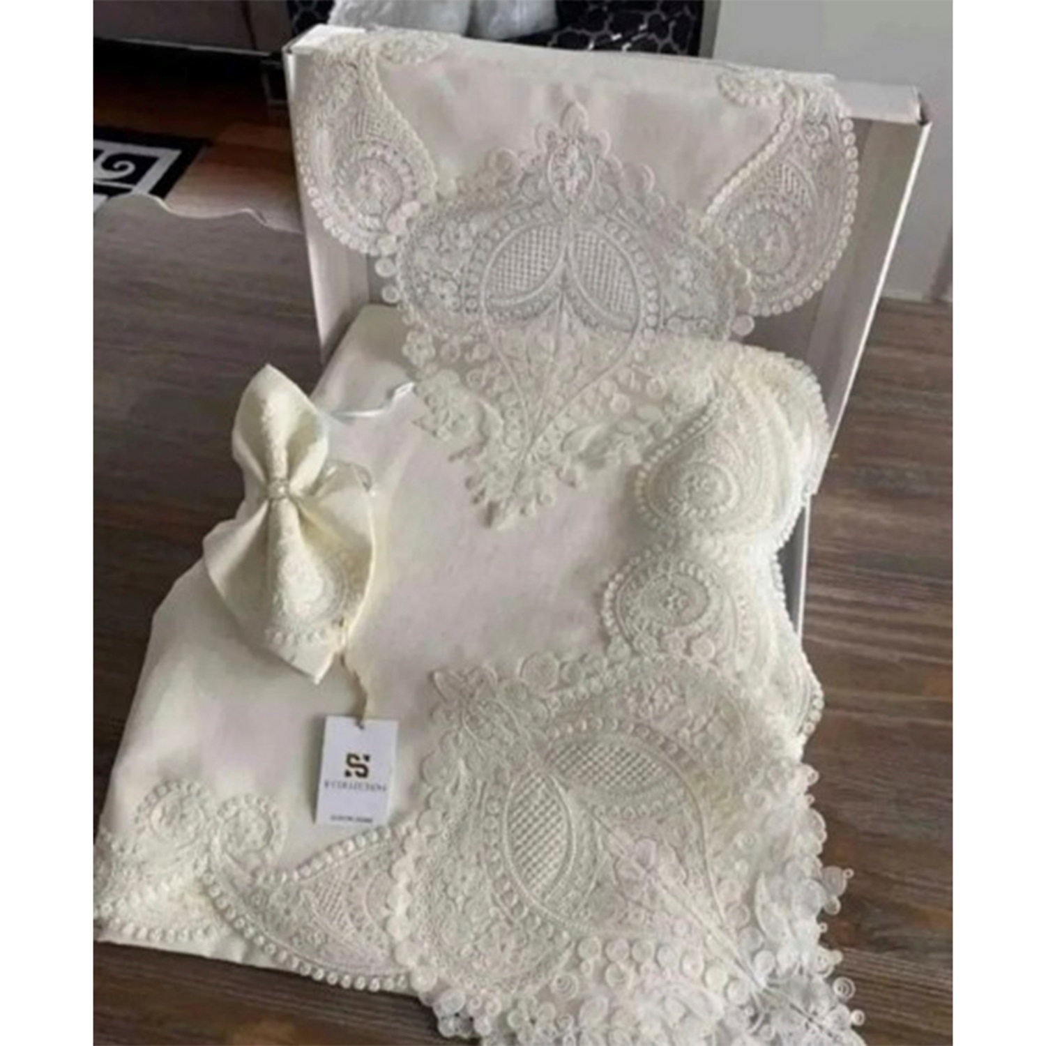** Peçete ve masa örtülerinin etrafın da fransız dantel kullanılmıştır.