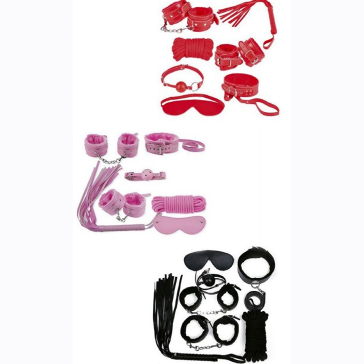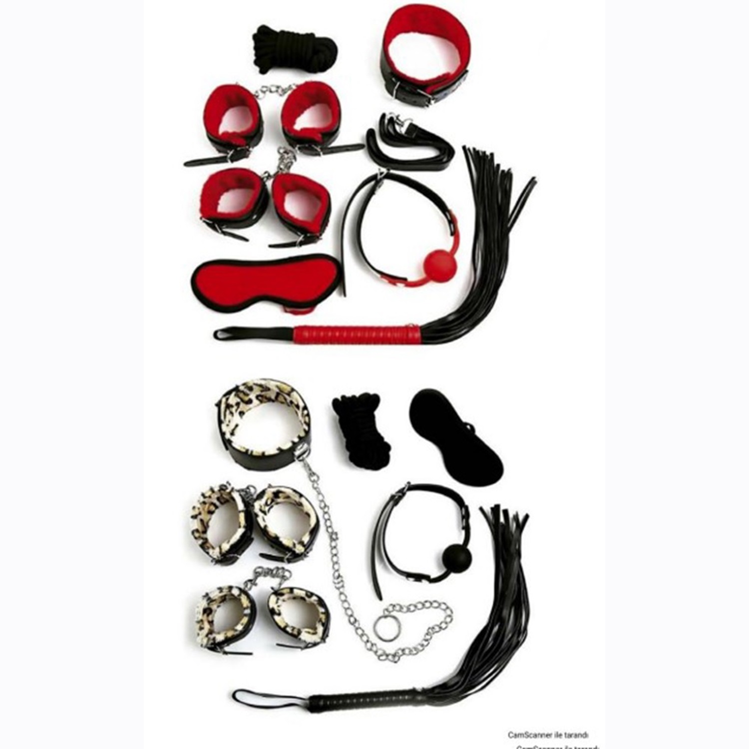 El kelepçesi, ayak kelepçesi, göz bandı. kırbaç, tasma, ağız topu ve bağlama ipinden oluşmaktadır.