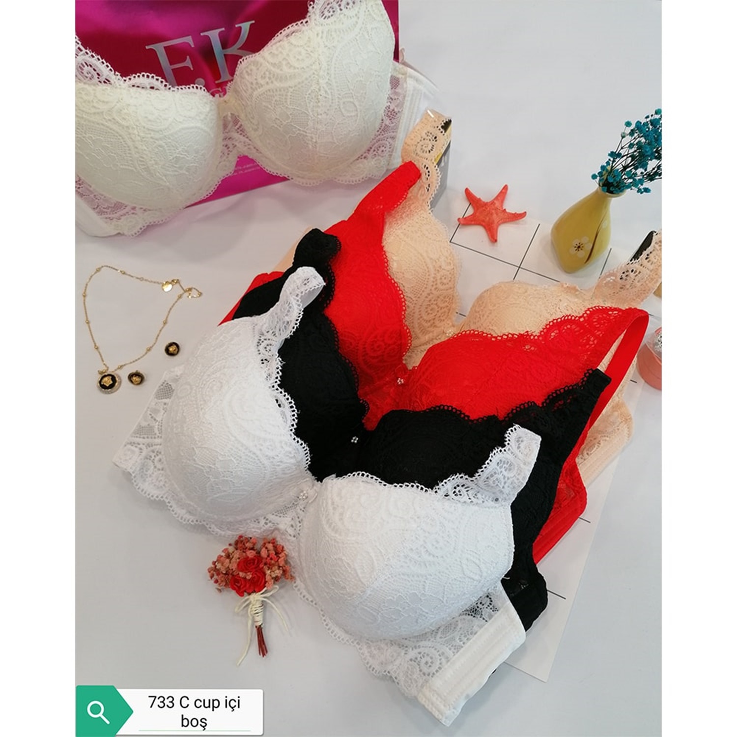 F.K 733 Bayan Dantelli Desteksiz Balenli C Cup Sütyen 85-100